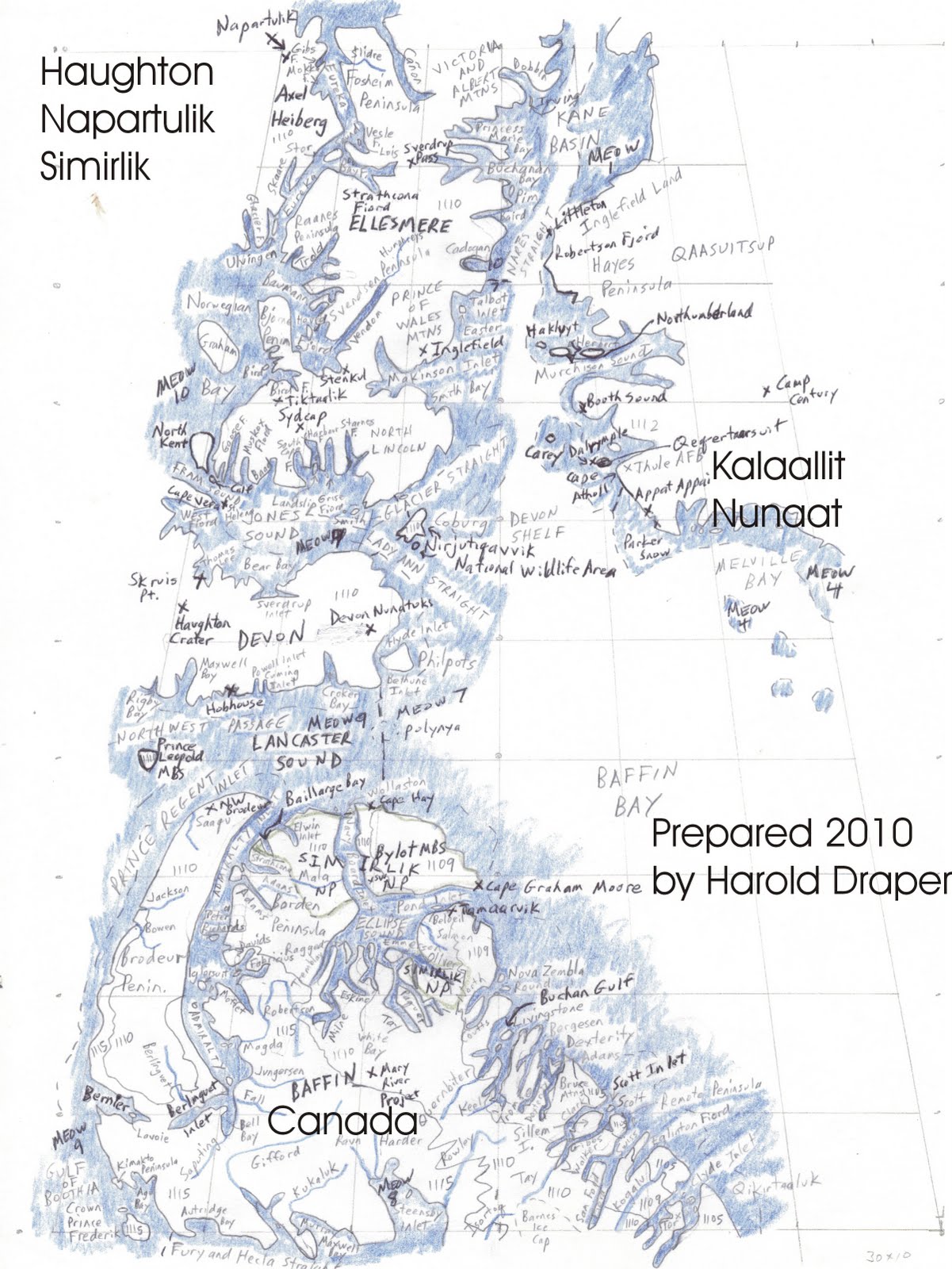 I. Map boundaries: 70 to 80 degrees North; 60 to 90 degrees West. The center of this area is about 2,000 miles north of Quebec City. This map contains ecoregion boundaries (terrestrial and marine), important bird area locations, national wildlife area locations, migratory bird sanctuary locations, river names, fiord names, fossil locations, and mine locations not found on atlas maps.