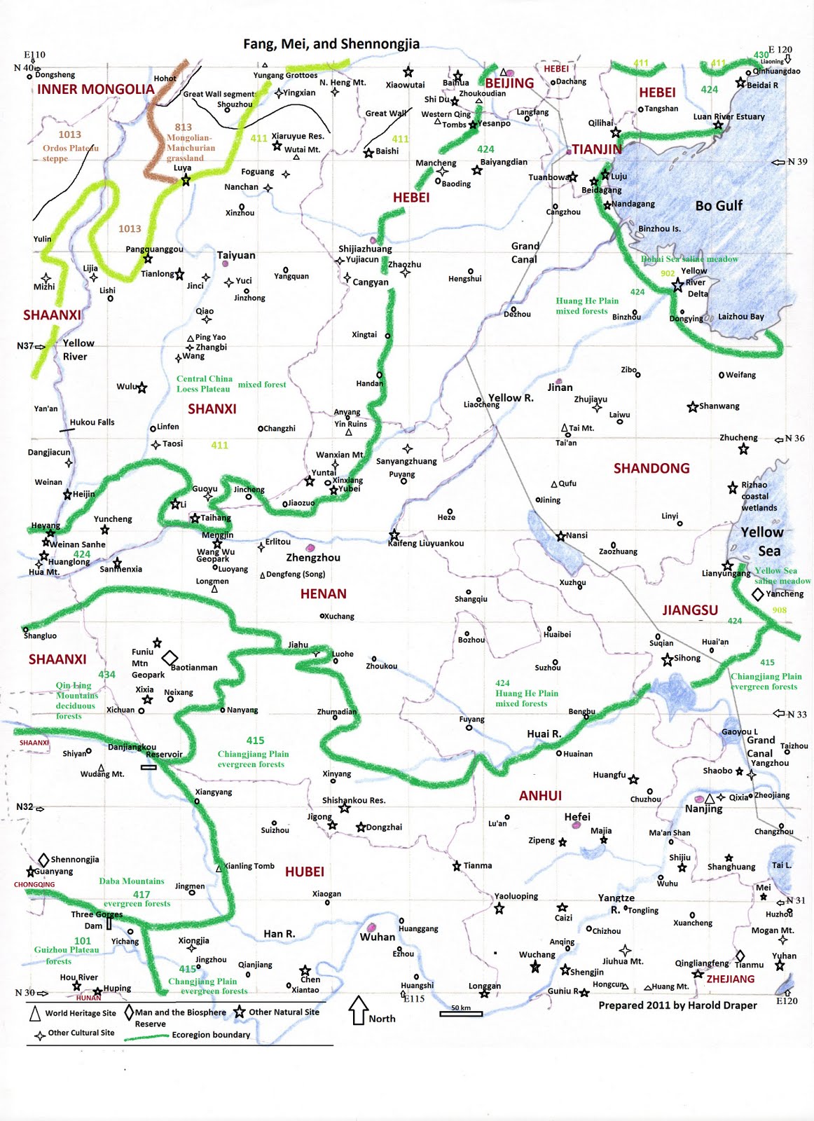 PA 434. Qin Ling Mountains deciduous forests. Found in Henan, Hubei, and Shaanxi in the map area. A biologically rich deciduous forest of oak, elm, walnut, maple, and pines. To the west of the map area are panda preserves. Found in Henan, Hubei, and Shaanxi in the focus area.