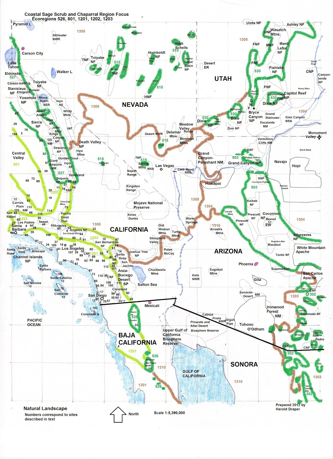 Cahuila Mountain Wilderness, San Bernadino NF, California (site 48). This chaparral-covered area is home to the red diamond rattlesnake. Ecoregion NA1203.