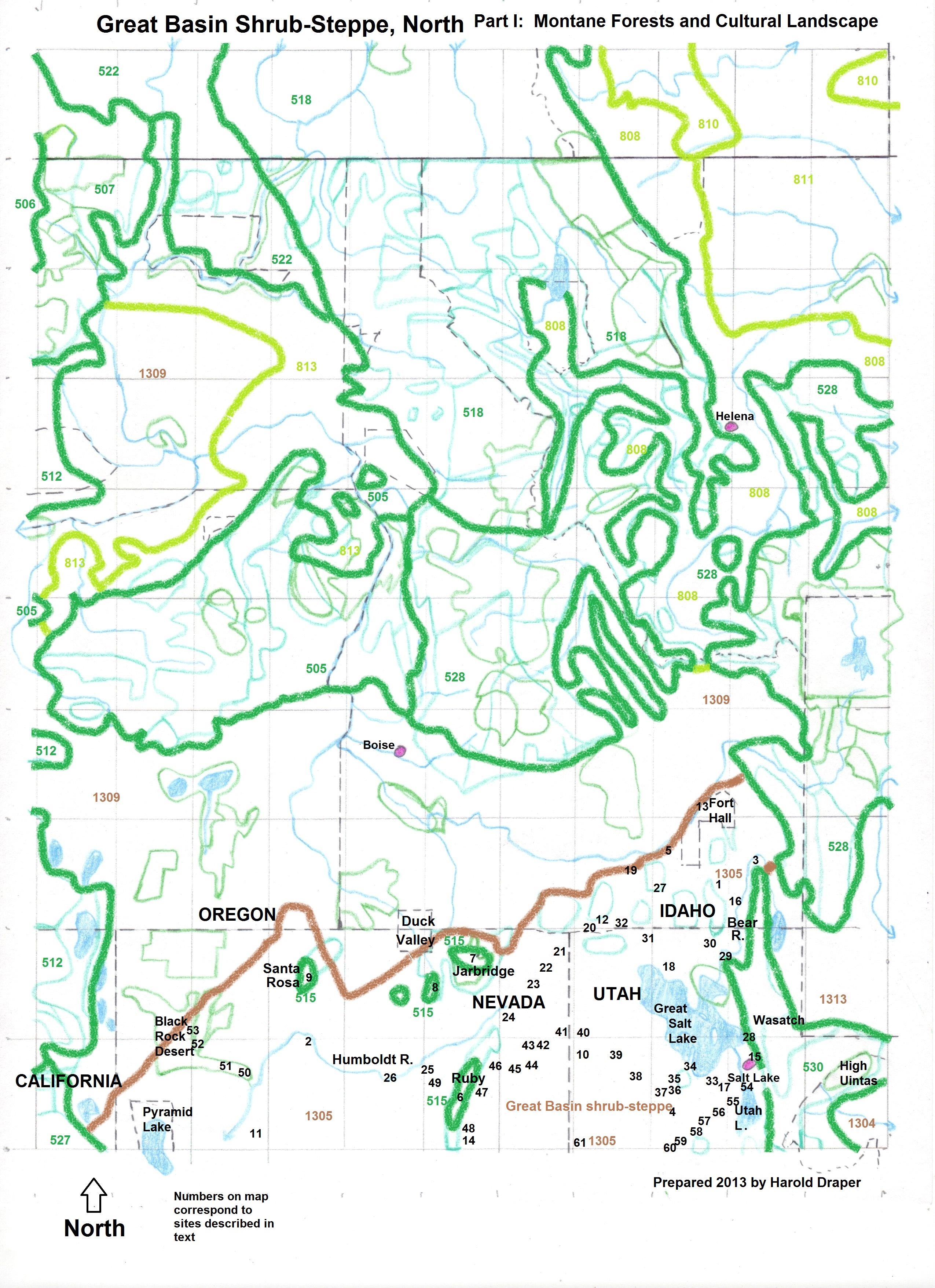 The Great Basin shrub-steppe ecoregion includes a portion of southeastern Idaho south of the Snake River. In this area the Great Basin is a high plateau overlooking the Snake River plain. The Idaho areas are less arid than the portions of the Great Basin in Nevada and Utah and tend to be dominated by sagebrush grassland at lower elevations, with mountain big sagebrush, small areas of juniper and woodland of aspen, Douglas-fir, and lodgepole pine at higher elevations. The Idaho portions tend to be less arid than the Snake River Plain to the north. The mountains tend to have more woodland than the rest of the Great Basin, and a number of areas have been designated as national forests. The perennial water source in the Great Basin in this area is the Bear River, which flows north through the Wyoming shrub-steppe into Idaho. Originally, the Bear River flowed northward to the Snake. However, about 140,000 years ago lava flows north of Soda Springs (site 3) blocked the water and it diverted south to the Great Salt Lake.