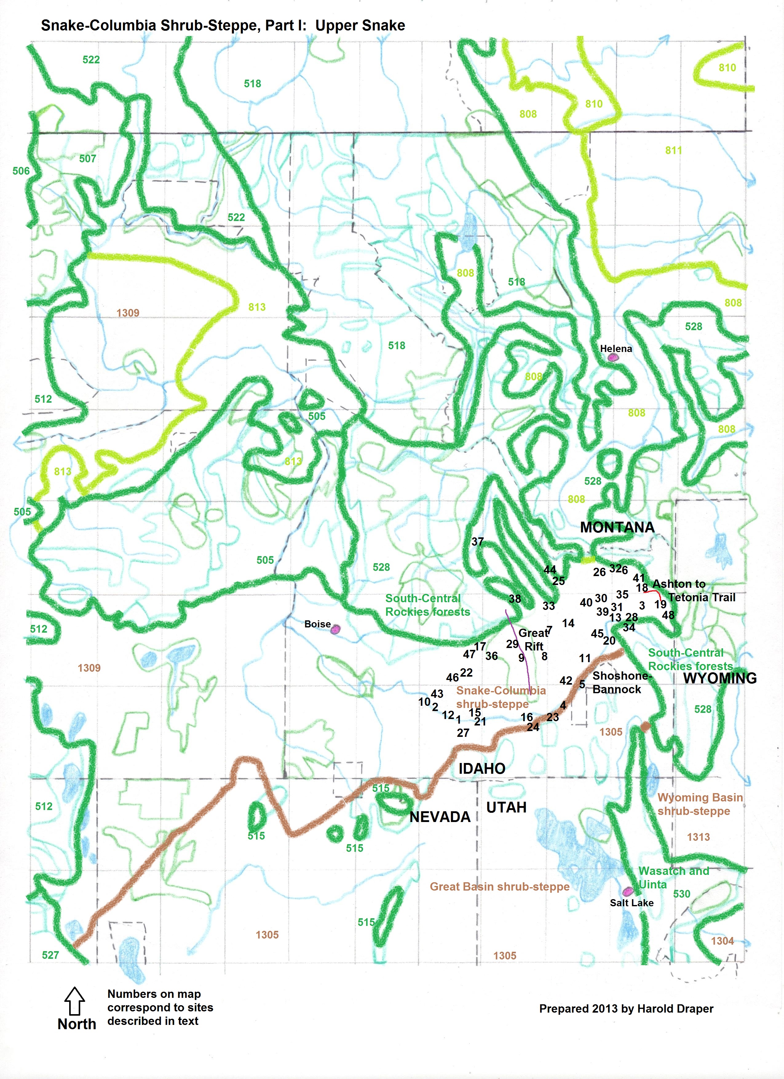 There are two NRTs in the Upper Snake subsection. Cress Creek NRT, BLM Upper Snake Field Office, Idaho (28), N43˚40’ W111˚43’, is a 1.1-mile trail beginning at the Snake River northeast of Ririe. It interprets a grass-sagebrush community along a perennial creek with watercress.