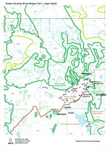 There are several distinct areas of this shrub-steppe ecoregion of the Columbia Plateau. For the purposes of this discussion, the ecoregion is subdivided into four sections, based on biological or geographic criteria. These are the Upper Snake River Plain, Treasure Valley and Owyhee Uplands, Oregon Lakes, and Columbia River Scablands.
